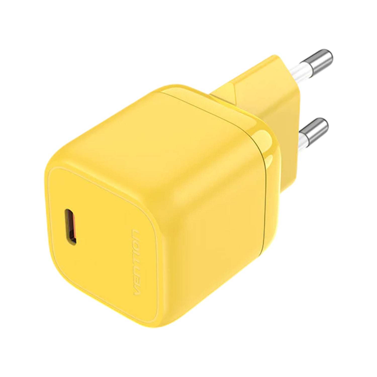 מטען VENTION USB-C קומפקטי בצבע צהוב עם טכנולוגיית GAN. עוצמה של 30W לטעינה מהירה ויעילה של מכשירים ניידים. עיצוב קטן ונוח לנשיאה.